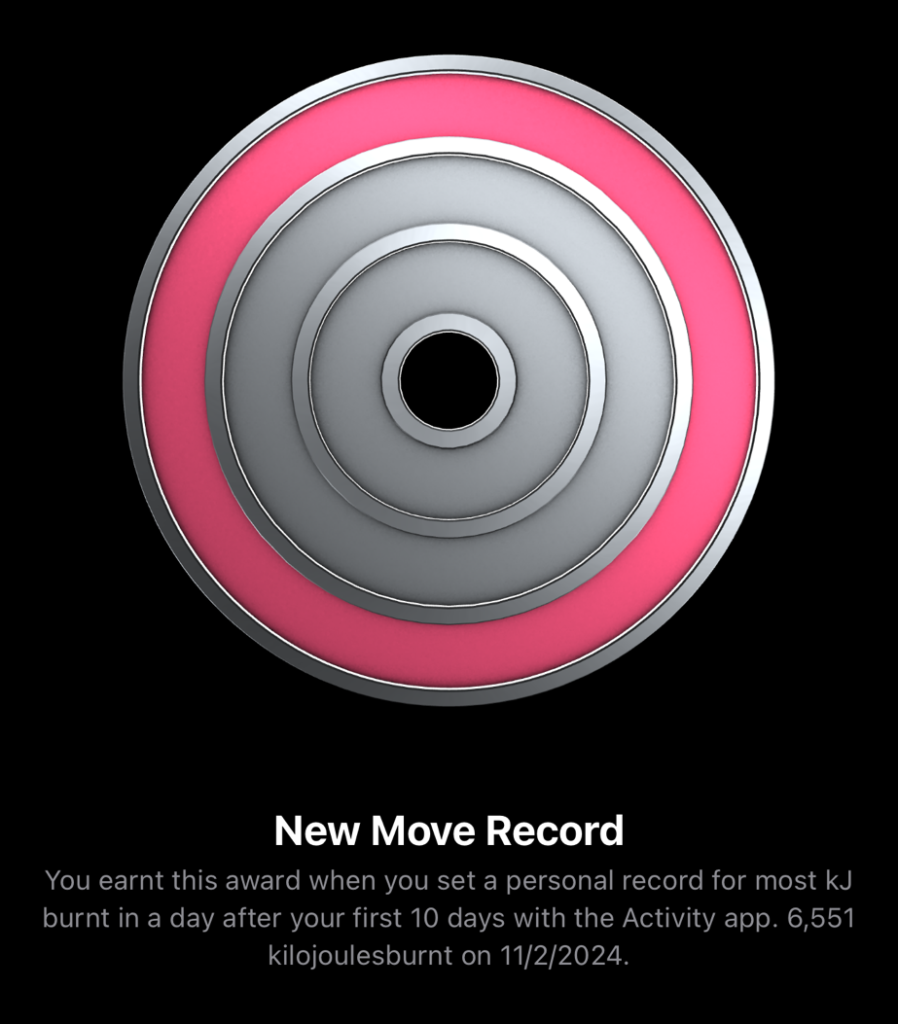 Apple Watch has achievements, all related to working out, to fitness and other such healthy stuff. So of course I am going to share my most impressive ones! My longest move streak – where you hit your move goal for the day – is now sitting comfortably at 38 days. I have a perfect month and a few perfect weeks where you hit all your goals for every day of said week or month. And even a new move record or burning through over 6,000 kilojoules in just one day.