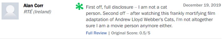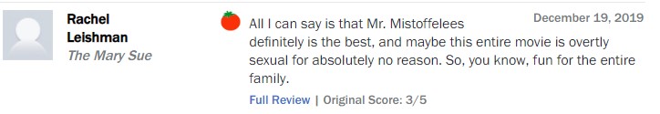 Overall, I rate this 10 Jellicle Cats out of 3 Jellicle Balls under 5 Jellicle Moons. And my rating still makes more sense than this acid trip of a movie.