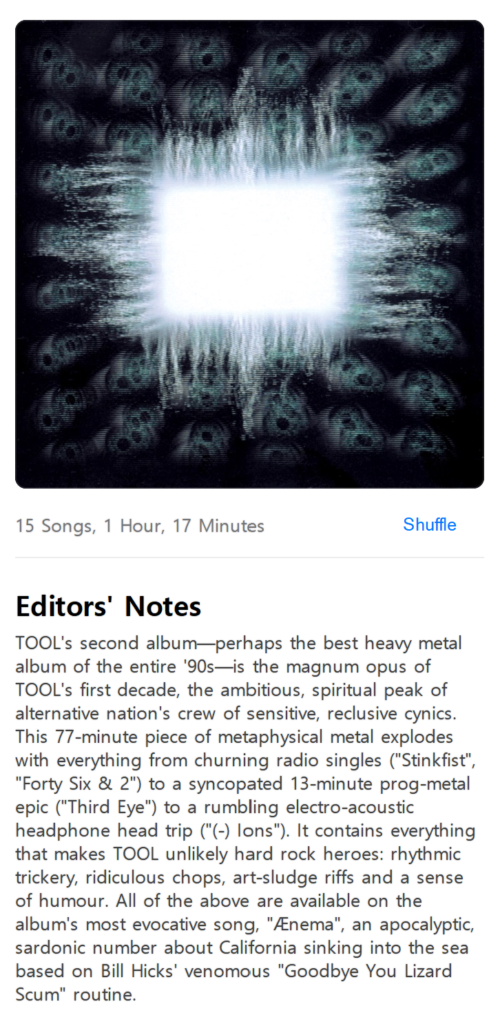 Got to an artist’s page or their latest album and you’ll be greeted with a write up from an editor. This is a nice little touch giving you a look behind the music. And Apple Music have recently started to lean into this in a big way – new albums often have an Apple Music editor sit down with the band and do a track-by-track deep dive into the album. For those that love everything around the artist and album in addition to the music, this little touch is great.