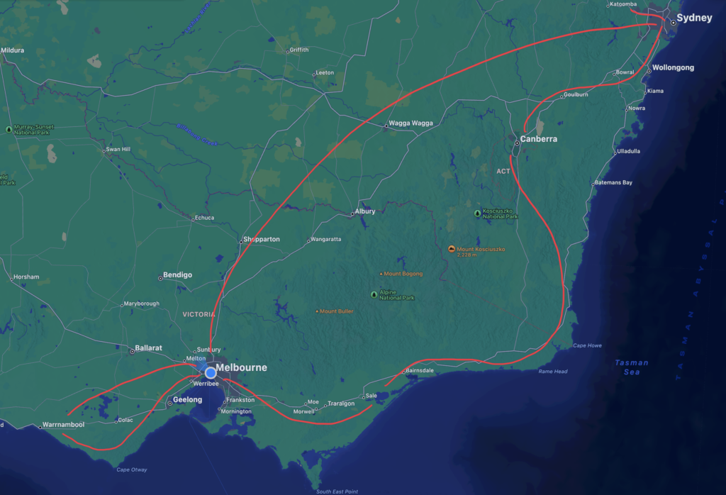 This is not the story of that trip. For the simple reason that it is yet to happen. Instead, this is our first Aussie trip with them. One of many as more and more family come to check out our new digs, I am sure. This one took us westward – out of Melbourne and onto the Great Ocean Road. Then back into Melbourne for a mini rest, and onto the long way to Sydney via Canberra. Ending with a long weekend in Sydney and a flight home on Sunday night. There has to be a more elegant way of putting this into words… Right now, I can’t think of one, so instead, heres a map!